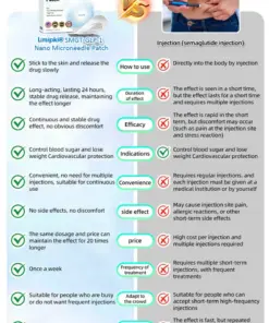 The Lmipki®NIDDK-Tirzepatide Nano Microneedle Patch offers a long-lasting. slow release of the medication. ensuring a stable effect over 24 hours without causing any discomfort. With the same dosage and price. it can maintain up to 20 times longer-lasting effects (similar to the difference between an IV drip and a single injection).